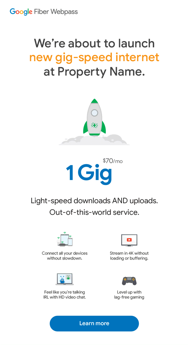Our go-to-market playbook ran in parallel with the first four months of a building’s lifecycle. The campaign mirrored the resident experience, positioning Google Fiber Webpass as their escape from the black hole of slow, unreliable internet. With a tone that was playful, punchy, and full of sci-fi charm, we invited residents to discover a whole new world of faster speeds, same-day installs, and refreshingly human support.